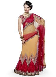 Red sarees are the traditional garment choice for brides in Indian culture. Sari fabric is also traditionally silk. Over time, color options and fabric choices for Indian brides have expanded. Today fabrics like crêpe, Georgette, tissue and satin are used, and colors have been expanded to include gold, pink, orange, maroon, brown, and yellow as well.Indian brides in Western countries often wear the sari at the wedding ceremony and change into traditional Indian wear afterwards (lehenga, choli, etc.). While the sari is typical to Indian traditional wear, clothing worn by South-East Asian countries like Burma, Malaysia, Philippines, and Singapore resemble it, where a long rectangular piece of cloth is draped around the body. These are different from the sari as they are wrapped around the lower-half of body as a skirt, worn with a shirt/blouse, resembling a sarong, as seen in the Burmese Longyi, Filipino Malong, Tapis, Laotian Xout lao, Thai Sinh's, and Timorese Tais. Saris, worn predominantly in India, Pakistan, Sri Lanka, Bangladesh, and Nepal are usually draped with one end of the cloth fastened around the waist, and the other end placed over the shoulder baring the midriff. Saris are woven with one plain end (the end that is concealed inside the wrap), two long decorative borders running the length of the sari, and a one to three-foot section at the other end which continues and elaborates the length-wise decoration. This end is called the pallu; it is the part thrown over the shoulder in the nivi style of draping.